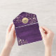 Step into rustic elegance with this all-in-one wedding invitation, featuring a regal purple wood background, glowing string lights, and intricate gold floral lace. A classic monogram adds a personal touch, while the back showcases your custom couple photo. Designed for modern convenience, it includes space for your wedding website and QR code to simplify RSVPs and share extra details. Perfect for fall, winter, or barn weddings, this invitation blends country charm with contemporary style for an unforgettable first impression.