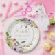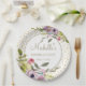 Purple and yellow watercolor floral with gold glitter birthday party paper plates personalised with your name and party date.