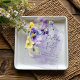 This simple but elegant acrylic birthday invitation design features a bouquet of purple, yellow, and lavender pansies and other flowers with greenery. The background is a purple watercolor splash on a textured white watercolor paper background. Created by Simply Farmhouse Press.
