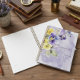 This simple but elegant design features a bouquet of purple, yellow, and lavender pansies and other flowers with greenery. The background is a purple watercolor splash on a textured white watercolor paper background. Created by Simply Farmhouse Press.