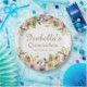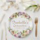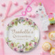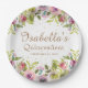 Elegant and colourful pastel pink, purple, and yellow watercolor floral with gold glitter on a white Quinceañera custom birthday party paper plates Personalised with the name of the celebrant and her party date. Contact me for assistance with customisation or to request matching or coordinating Zazzle products for your celebration.