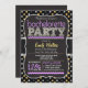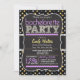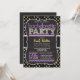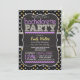 Bachelorette party invite with retro chalkboard look on black, dark grey, and yellow stars pattern with purple ric rac design elements and chalk look fonts.
