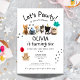 The invitation includes space for party details and a playful back design with the quote:
