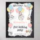 Celebrate your kitty's first birthday or host a cat-themed 1st birthday bash with this adorable poster, featuring charming cat illustrations against a whimsical chalkboard background. Ideal for girl birthdays and cat lovers alike, this poster adds a touch of feline fun to any party decor.