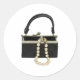 Black fabric purse with silver ball clasp used to hold items including a strand of pearls