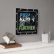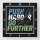 This black wall clock features the motivational text "PUSH HARDER GO FURTHER" stacked vertically in a bold, slightly distressed font with blue and green colour gradients. A silhouette of a runner, who appears to be a light-skinned individual, in motion is placed to the right of the text, conveying speed and progress. The design encourages perseverance in achieving goals.