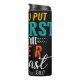 This powerful design proclaims "WHEN YOU PUT GOD FIRST You Will NEVER Be Last." "GOD FIRST" is prominent in a distressed teal, while "NEVER" is in a bold orange. "Be Last" flows in elegant white script, conveying a strong message of divine priority and assured blessings.