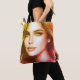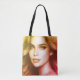 An image of a young woman is on the front and back of this reusable shopping bag/tote bag.