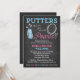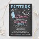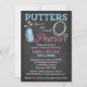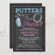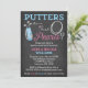 Cute putters and pearls gender reveal party invitations. A unique design featuring a blue golf bag and clubs with white pearls on a chalkboard background. Easily personalize with your event details. GOLF GRAPHICS by JW Illustrations © JESSICAWEIBLE.COM