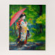 Japanese geisha Puzzle. Design name Just walking. The work depicts a serene summer scene in a park, with a dominant green colour gradient creating a lush and calming atmosphere. In the foreground, a geisha in traditional clothing walks leisurely, wearing a colourful kimono and sporting traditional makeup. She is holding a pink umbrella to protect herself from the sun.