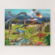 The dinosaurs painting on this jigsaw puzzle with an incredibly realistic image takes us on a fantastic journey through time and surprises with beautiful landscapes and extraordinarily vivid scenes from the life of dinosaurs. On this journey, humour and incredible discoveries await you upon closer inspection. Dinosaur puzzles are very popular among children, especially boys. This picture differs from all others in its photographic quality. This is one of the best dinosaur images to date.