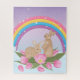 purple background with rainbow and stars two bunnies sitting on clouds with flowers and leaves