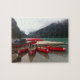 A puzzle showing red canoes on Lake Louise in Canada on a misty day