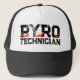 Pyro Technician trucker hat with burning flames. Vintage typography design with hot flaming fire bursts. Custom cap colour. Pyrotechnics hat.