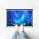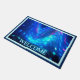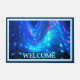 A pink and blue, fractal interpretation of the Northern Lights reflected on the surface of the sea. Qaanaaq is a settlement in northern Greenland. Text reading, "WELCOME" also appears.