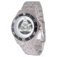Has heft and feel of expensive stainless steel quartz watches. Good band with safety catch. I removed links, which is easy because engraved arrows show direction to push the linking pins. As always by this seller, the image (a railroad logo) is a perfect reproduction of my emailed image, and is precisely spaced and aligned.