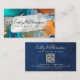 Present your best self to your clients, with these elegant, sophisticated, simple, and modern custom name QR code business cards. A sparkly, faux silver foil brush stoke with handwritten typography overlays a rich, silver veined, turquoise blue, and yellow orange watercolor background on this chic, elegant, modern business card. Personalise with your full name and business on the front. Fill in the dark textured blue watercolor back side with your personal QR code, phone numbers, email, website, and social media accounts. Makes a chic, professional, and stylish statement wherever you go.