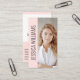 Make a memorable first impression with this modern and dynamic business card design. The bold vertical strip of blush pink on the front elegantly frames your name, while a striking photo of you captures attention and adds a personal touch. The reverse side features your company logo, name, title, and all essential contact details, including a QR code, presented in a clean and organized layout, ensuring both professionalism and approachability.