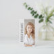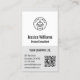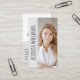 Make a striking first impression with this unique vertical business card design that places the individual's professional photo front and center in a large, bold format. A chic gray sidebar on the front features the name in a vertical orientation, adding a sophisticated, modern touch. The back is cleanly divided into light gray and white sections, prominently featuring the logo, name, title, and all contact details, including a QR code for easy digital sharing.
