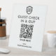 A simple custom white business Guest Check In & Out QR code pedestal sign in a modern minimalist style.