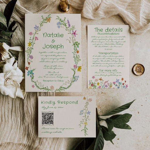 QR Code Hand Drawn Colourful Floral Wreath Wedding Invitation