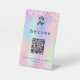 Blush pink, purple, mint green, holographc bacground decorated with confetti. With the text: Welcome. Personalise and add your business logo, QR code and text.