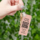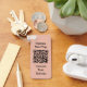 Custom QR code keychain. Custom background colour (use a light one). Custom text on both sides.