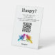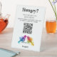 Introducing the "Rainbow Lovebirds Collection" pedestal sign, a delightful addition to your wedding reception decor. At the top of the sign, in bold and inviting typography, the caption "HUNGRY?" welcomes guests to indulge in the culinary delights awaiting them. Below the caption, a text encourages guests to scan the QR code conveniently provided underneath to access the digital menu and explore the tantalising array of dishes.