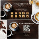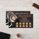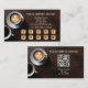 Loyalty business card featuring a cappuccino and espresso on a dark wood background. The gold and rose gold stylised punch number background images are on a separate file and you can delete them if you prefer custom fields. The heart image on the front is also optional. On the back an easy to customise QR code template is added.