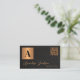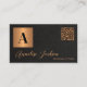 Stylish modern monogram initial and signature script name business cards with scanning QR code to website featuring a faux metallic gold copper square with initial letter over an elegant black leather like (PRINTED TEXTURE) background.