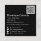 Simple Minimalistic Professional Business Card Design in Black and White with Social media Icons on the reverse on a black background, there is a place for your QR code or logo.