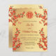 Red cherry blossom branches and two butterflies on a gold background. Chinese wedding invitation with a red double happiness symbol.