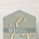 Simple, contemporary, minimal, unique sage green wedding all-in-one invitation with photo, QR code and trendy elegant gold ampersand - monogram with initials of bride and groom.