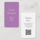 QR code girly business card, with a simple flower design on a purple background. With customisable lettering, you add your own information.You also add your website to the QR field for connecting with your clients. Great for promoting your consultant business with a floral style.