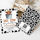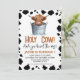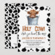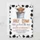 Cute holy cow themed birthday invitation for a little boy featuring a cute highland cow in a bucket and a black cow print pattern around the edge of the invitation. This highland cow birthday invitation can be used for any age and features a replacable QR code on the back.