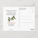 Charming nostalgic vintage winter vignette featuring rustic winter scene with farmer bringing home a pine Christmas tree to his snow-covered cottage bordered by festive holly. Back features complementary graphics and editable text fields.