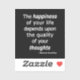 Quality Thoughts? Then a Happy Life… The actual quote from Roman Emperor and philosopher Marcus Aurelius is: "The happiness of your life depends upon the quality of your thoughts: therefore, guard accordingly, and take care that you entertain no notions unsuitable to virtue and reasonable nature." White text over black sticker.
