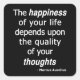 Quality Thoughts? Then a Happy Life… The actual quote from Roman Emperor and philosopher Marcus Aurelius is: "The happiness of your life depends upon the quality of your thoughts: therefore, guard accordingly, and take care that you entertain no notions unsuitable to virtue and reasonable nature." White text over black.