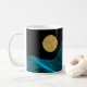 Quantum Disco Dimension Purple Blue Black Gold Mug features aqua blue and black abstract dimensional lines in space with a shiny gold planet-like sphere in the upper left corner floating above the geometric quantum waves of purple and green forming an abstract design against a deep black background. This mug inspires deep thoughts with a touch of fun in a style that's contemporary, boho, spiritual, and eclectic. See more beautiful coordinating and matching customisable designs with a spiritual theme in our store at zazzle.com/NextDimension.