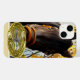 This fun & festive iPhone case Features A black quarter horse with a orange harness on looking at you though the kitchen window. The window ledge below him and the grayish wall as well. You can see the yellow fall leaves on the maple tree outside the window.