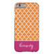 Simple, modern, elegant and trendy Quatrefoil, Lattice, Trellis or Moroccan pattern in Orange and White design with an accent stripe in Berry Pink colour and custom Monogram or Name in a preppy script font for Apple iPhone 6 cases and covers. Personalise your gift with your own name or initials. Choose your own font and colours to make it your own. This chic and stylish geometric pattern iPhone6 case will make a perfect gift or fashion accessory for Christmas, Birthday, College or School. Suitable for men, women, girls, boys, teenagers and kids. For more colours go to zazzle.com/d_zone_designs