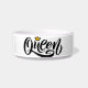 A stylish pet bowl with the word "Queen" elegantly scripted in black, adorned with a small golden crown.
