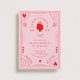 A vintage playing card inspired Queen of Hearts and Alice in wonderland themed birthday party invitation design in a bright red and light pink colour palette with heart and flower details.