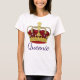 Let the world know you're the Queen. This royal t shirt features a queen's crown in gold and red with the word "Queenie" underneath in black script.