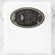 Classy black oval honey sticker with mediaeval heraldic honeybee design. Honeycomb pattern at top and bottom of oval. "Honey" is printed in a chiseled metallic font. Name of apiary is written in decorative curved text above the bee.