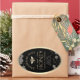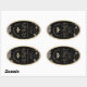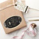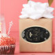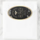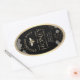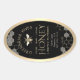 Classy black oval honey sticker with mediaeval heraldic honeybee design. Honeycomb pattern at top and bottom of oval. "Honey" is printed in a chiseled metallic font. Name of apiary is written in decorative curved text above the bee.