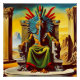 The A.I. created interpretation from my description of a surreal representation displays the Aztec god, Quetzalcoatl with a bird-like head, adorned with an elaborate headdress, sitting regally on a stone throne. Surrounded by classical columns and a backdrop of rocky desert scenery, the god exudes a sense of mythical authority.