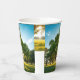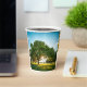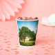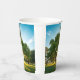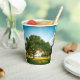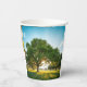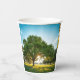Custom printed paper cup with a green field and big tree artwork around the sides.