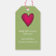 Pretty quilting business hanging product tag done in whimsical pink, green, and white. Graphics of a pretty colourful quilt and a heart decorated scalloped band, decorates the front of the tag, with a big pink heart, on the solid green back. Personalise the pink and white text for your quilting business.
