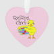 Quilting Chick in curly text with a cute yellow chick holding a quilt is a humourous gift design for quilting family and friends at birthdays and holidays.